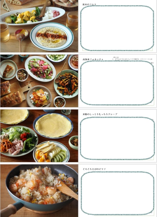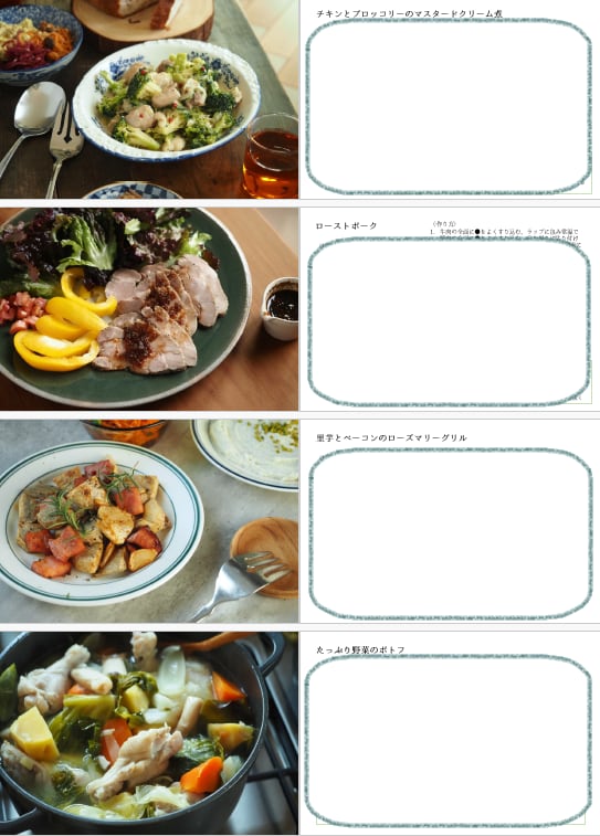 メインから副菜、スープ、ごはんもの、スイーツまで幅広く組み合わせてあります。